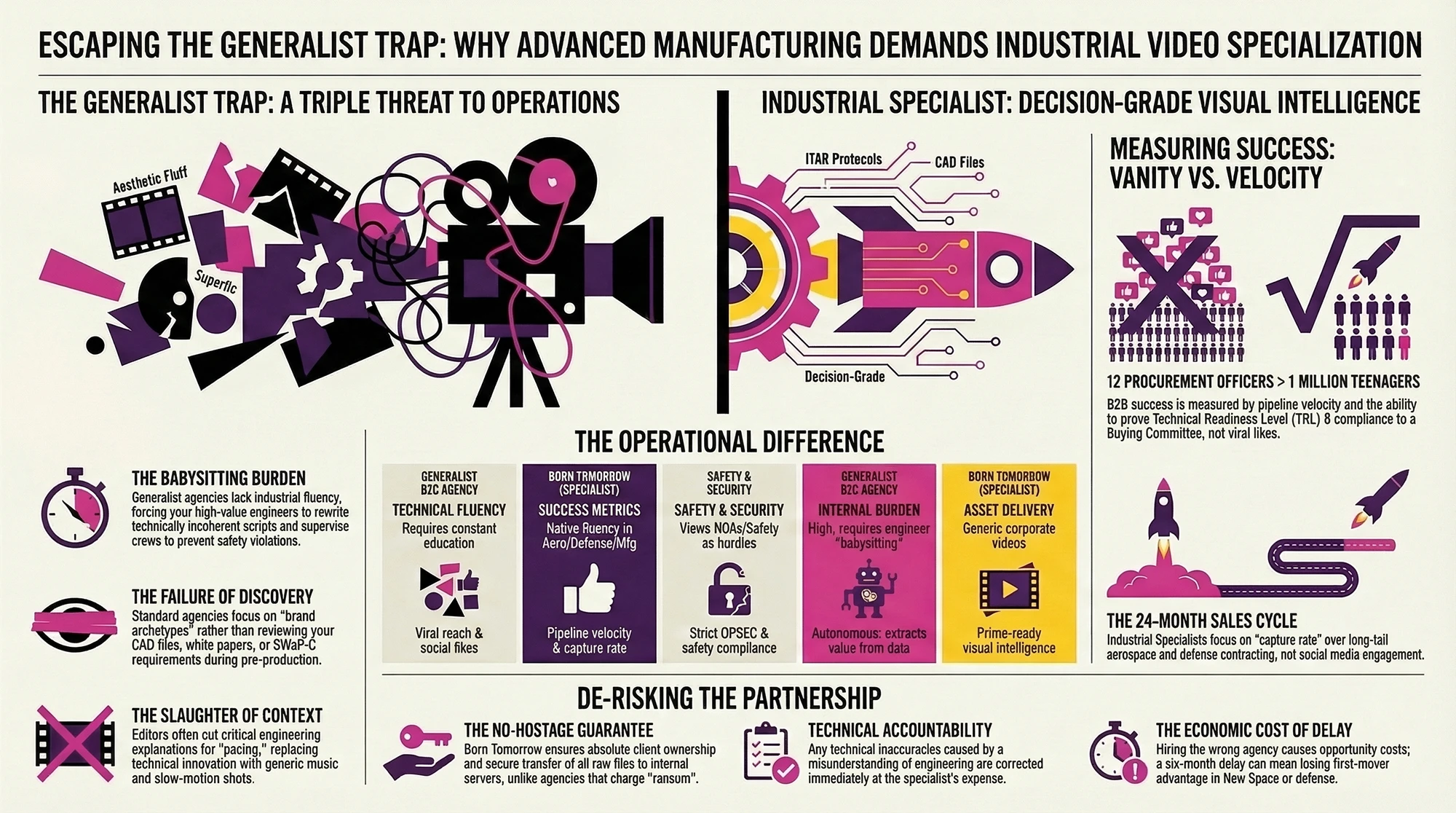 At Born Tomorrow, we measure success entirely differently. We measure pipeline velocity. We measure capture rate. We measure the ability of our visual assets to de-risk a multi-million dollar purchase for a skeptical technical buyer. We understand that in your sector, a video with two hundred views that secures a ten-million dollar manufacturing contract is an infinitely higher return on investment than a consumer video with two million views that generates zero revenue.