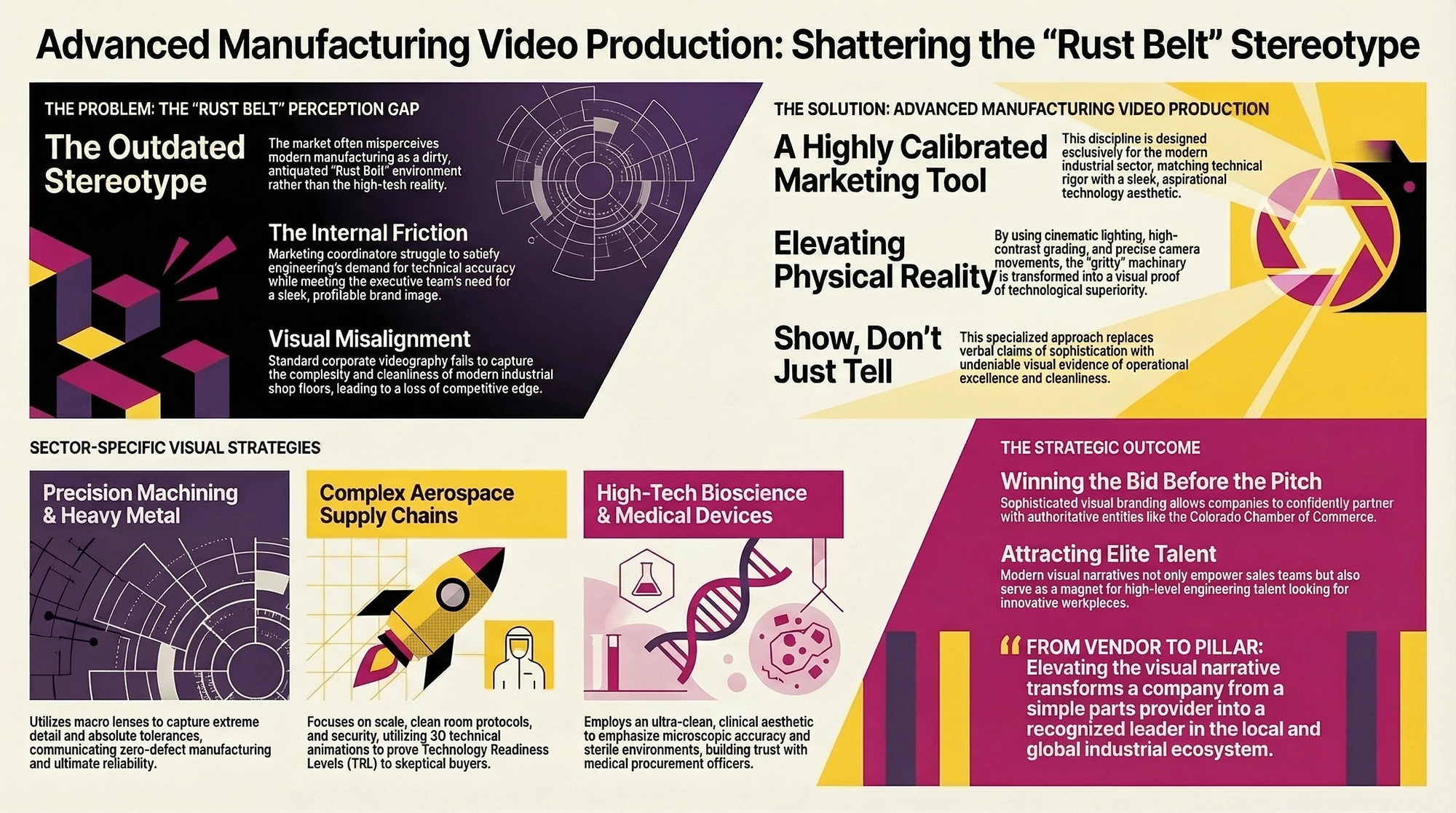 Your reality is vastly different. Colorado is a recognized hub for advanced manufacturing. Your facility is a pristine environment. It integrates advanced robotics, high-tech bioscience, and complex aerospace supply chains. The internal frustration you feel is entirely justified. You are marketing a highly sophisticated operation, yet your current visual assets fail to differentiate you from the outdated factories of the past.